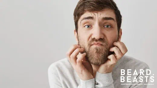 Young man in a light gray shirt scratching his beard while grimacing in discomfort, likely due to beard rash. The neutral background highlights the subject, and the Beard Beasts logo in the bottom-right corner emphasizes professional men's grooming.